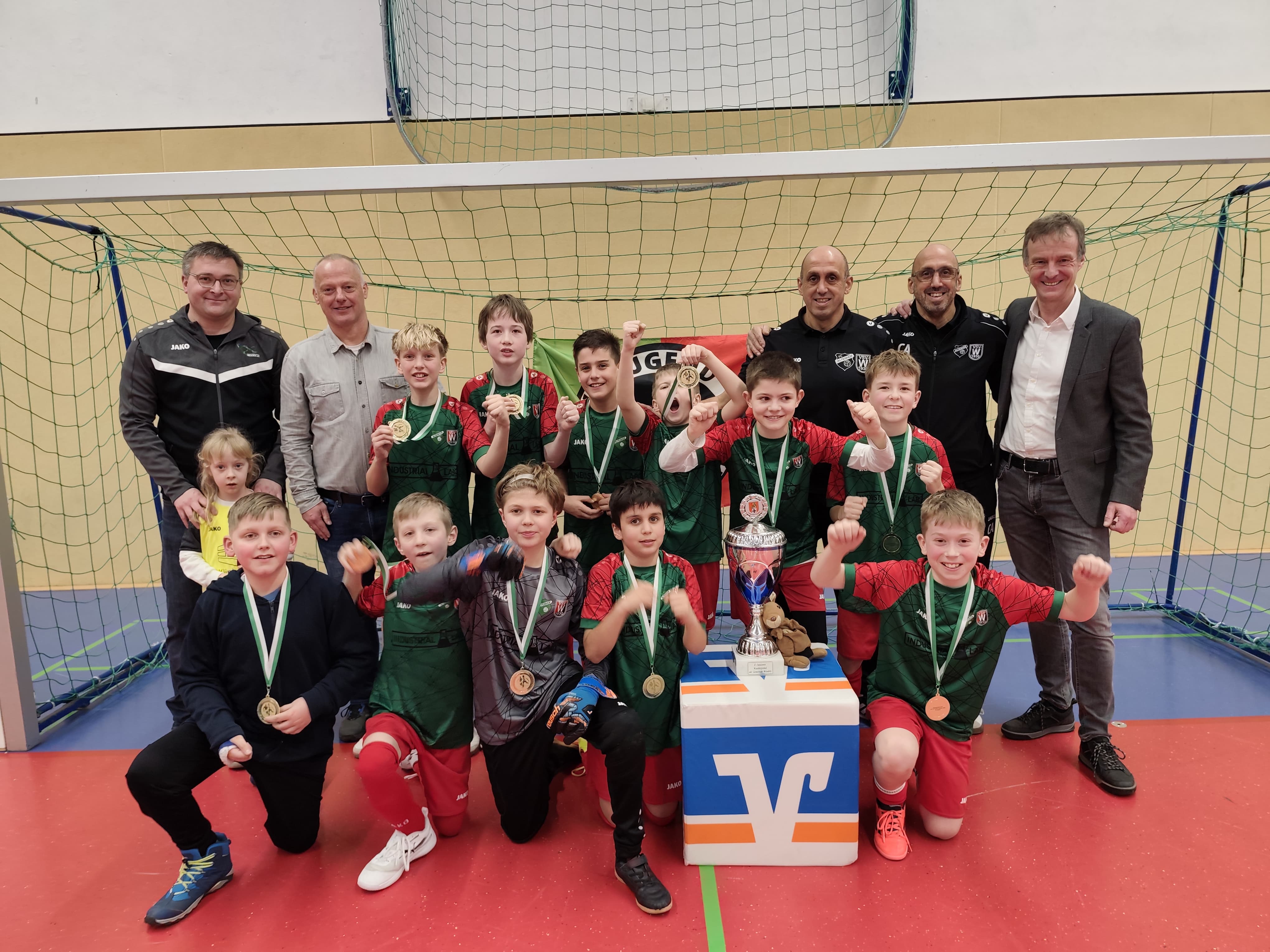 Über das gesamte Turnier hinweg zeigte unsere E1-Mannschaft konstante Leistungen, gutes Zusammenspiel und die nötige Ruhe in den entscheidenden Momenten. Die Vorrunde wurde mit satten 12 Punkten und einem Torverhältnis von 23:4 aus 4 Spielen als Gruppenerster der Gruppe A souverän abgeschlossen. Im Halbfinale behielten die Jungs mit 2:0 gegen Hünsborn-Rothemühle 1 die Oberhand. Auch Ottfingen 1 konnte unsere JSGler nicht stoppen, das Finale wurde mit 3:2 gewonnen, der Rest war Jubel. Wir gratulieren der Mannschaft und Celal und Celil Aydin für ein grandioses Turnier.