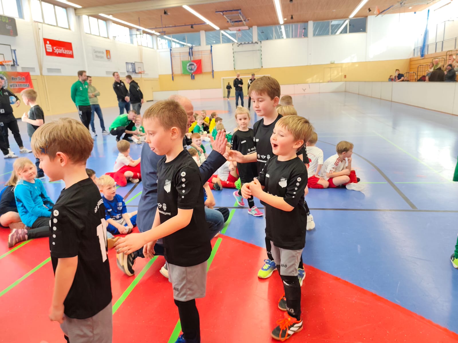 Nach der F-Jugend folgte das Turnier der E-Jugend, wo auf den Gemeindepokal-Sieger der Wanderpokal wartete. Auch hier waren die Ränge der Halle voll und auch die Stimmung war sensationell.