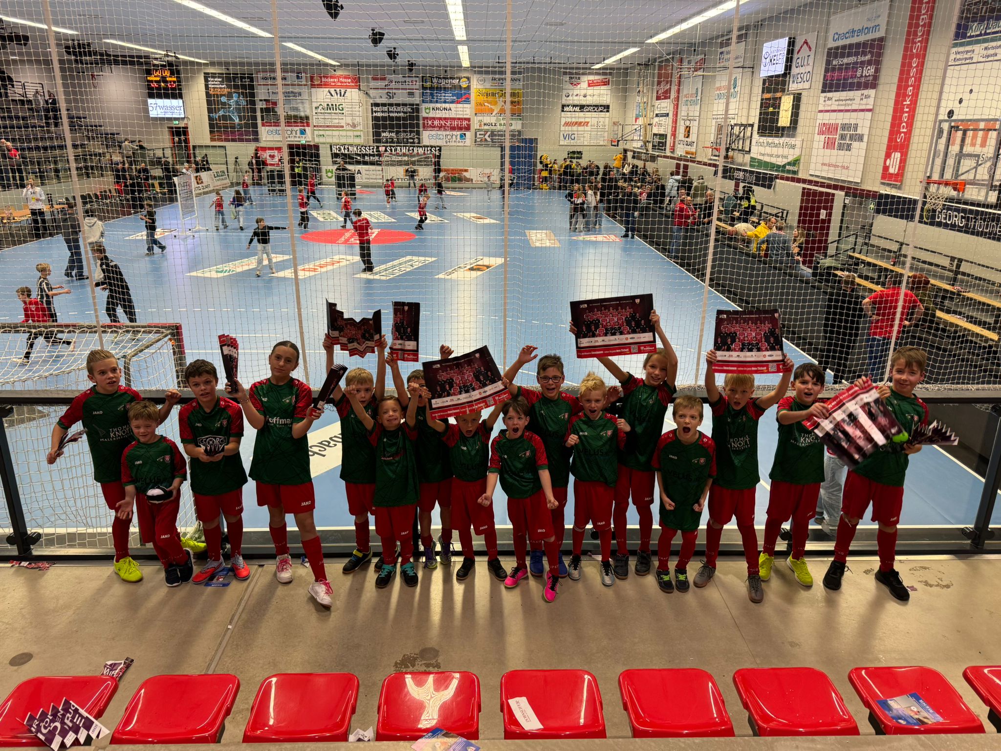Unsere kleinen Fußballer hatten die Möglichkeit erhalten, das Spiel aus ersten Reihe zu verfolgen. Sie bekamen einen Eindruck einer neuen Sportart, die einen neuen Eindruck von Kampf, Härte und Schnelligkeit aufzeigt. Die Stimmung in dem Hexenkessel war bis ohrenbetäubend super, sodass der ein oder andere nicht mehr aus dem Staunen herauskam. Bei dem rasanten Spiel wurden einige Fantas, Sprite und Currywürste vernichtet. Leider verlor der TuS Ferndorf das Spiel mit 22:25 gegen den HSC Coburg.